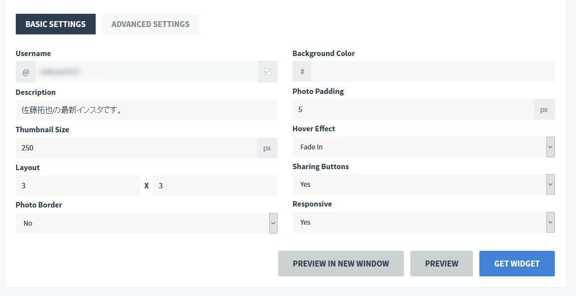 あとはサムネイルのサイズなど項目を設定して、GET WIDGETを押せばそれで貼り付けるタグが生成されます。